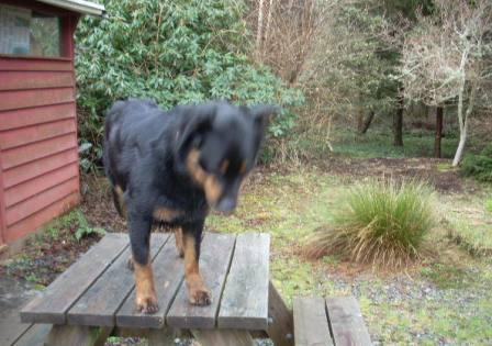 "What do you mean dogs don't belong on picnic tables? Looks great up here to me...."